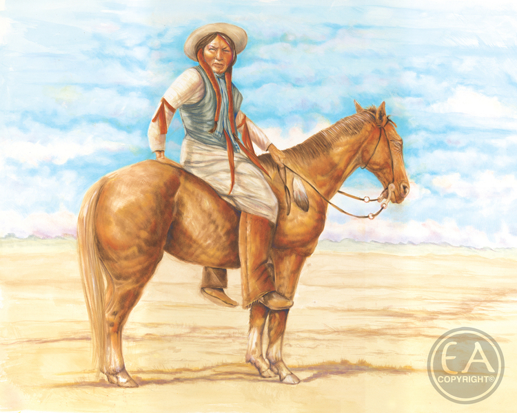 American Indian Women Warriors - Buffalo Calf Road Woman - Medium watercolor and pastel. Archival quality giclee print. Buffalo Road Calf Woman rescued her wounded brother at the Battle of the Rosebud, and fought side by side with her husband at the Battle of Little Big Horn. She is credited with striking the blow that knocked George Armstrong Custer off of his horse shortly before he died.